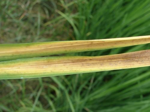 Empezando por las puntas, las hojas más viejas presentan amarilleo progresivo y la posterior necrosis de color marrón claro. El crecimiento aéreo de la planta es escaso comparado con una planta sana.