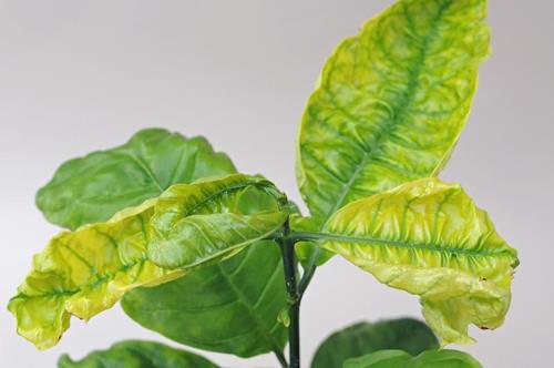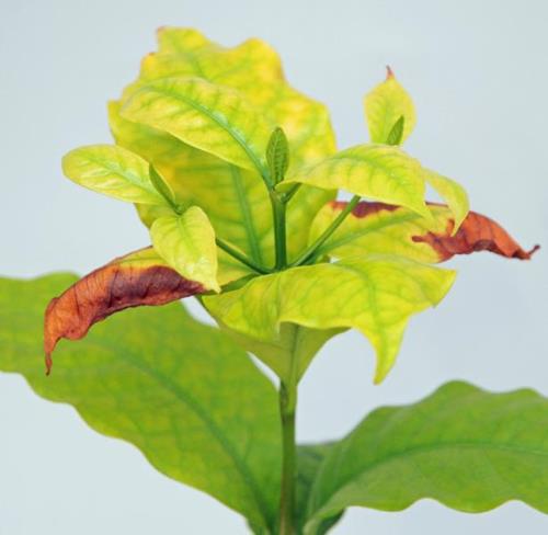 Hojas jovenes muestran clorosis amarillo-verdoso intervenal, posteriormente uniforme. Con deficiencia más avanzada, un toque de color anaranjado y puntos necróticos marrones se ven en el area marginal e intervenal de la hoja.