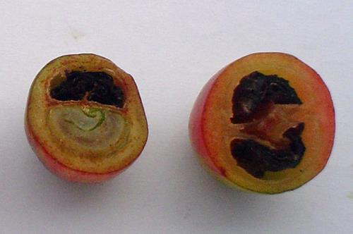 La producción de cerezas sufre una reducción del tamaño de las bayas y aumento en el número de cerezos vanos. Los granos se marchitan y toman un tono negro. Color de la piel y la carne es de color naranja-verde en lugar de rojo.