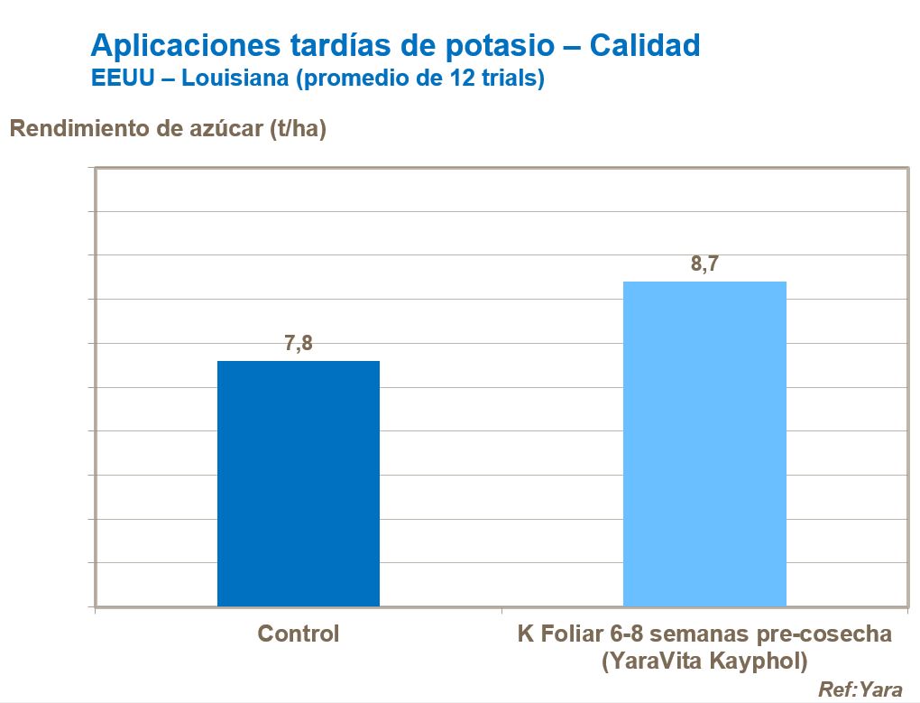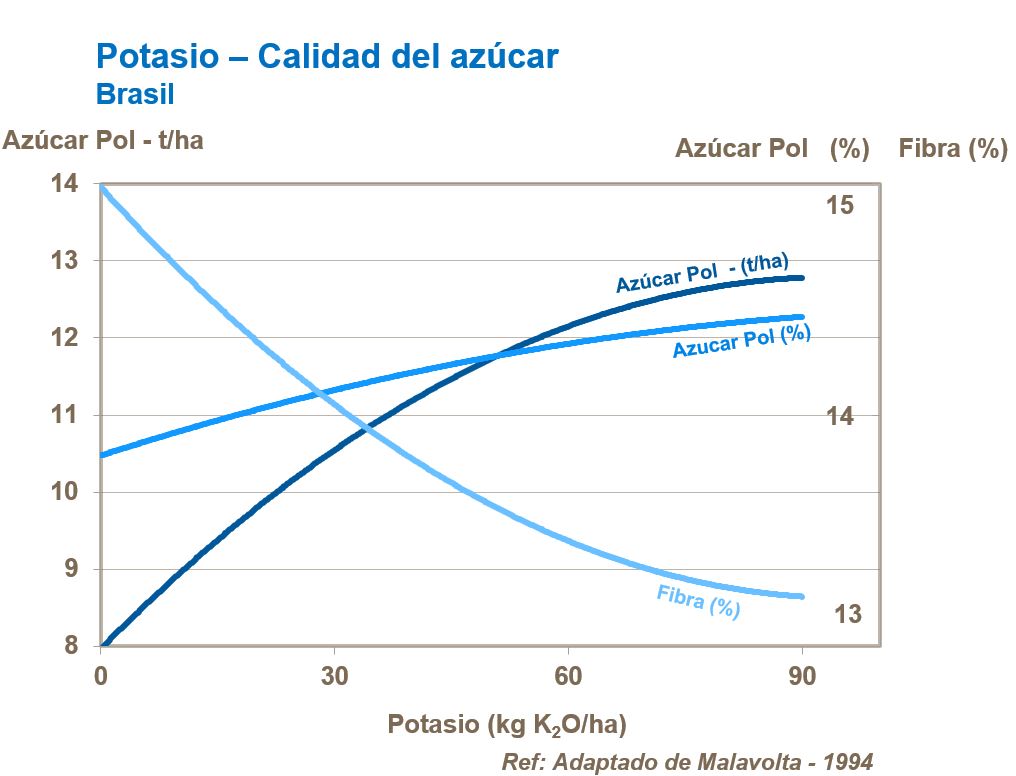 No obstante, niveles muy altos de potasio pueden reducir los niveles de sacarosa. Ensayos muestran que potasio foliar aplicado 6 a 8 semanas antes de la zafra, reduce el contenido de fibra con 28%.