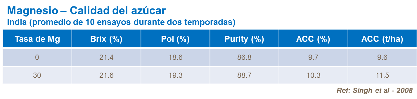 Suministro de magnesio también influye en el azúcar y el contenido de sacarosa se reduce donde haya carencia de Mg. Es importante equilibrar los niveles de potasio y magnesio, como altos niveles de potasio podrá restringir y competir con la absorción de magnesio.