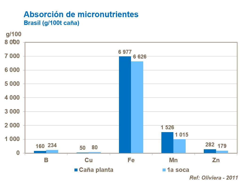 En la etapa temprana del ciclo de vida del cultivo se absorbe una cantidad significativa de calcio, lo que juega un papel importante en el enraizamiento y en la integridad de las células de la planta. En comparación, el azufre y el magnesio se absorben más lentamente y en estadios de crecimiento posteriores, ambos son importantes para la calidad del azúcar y las proporciones son mayores en el tallo de la planta que en otras partes. Los suministros de azufre y magnesio deben mantenerse para que el cultivo genere un rendimiento alto de azúcar.