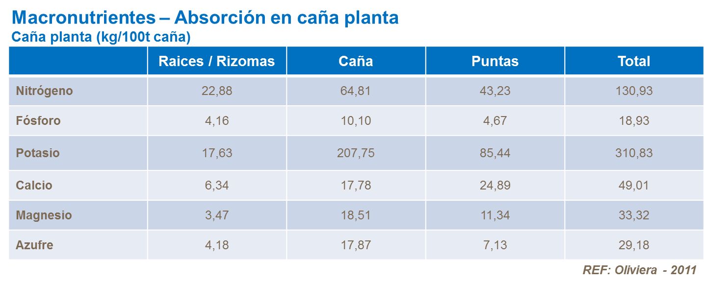 Las necesidades de nutrientes van a variar dependiendo del rendimiento esperado y del ciclo del cultivo. Las cañas planta en general absorben más nutrientes que los ciclos de cultivo sucesivos. Sin embargo, la caña planta se beneficia más de la mineralización de N y por lo tanto para alcanzar el mismo rendimiento, la demanda de fertilizante N es mayor para un cultivo sucesivo que para una caña planta.
