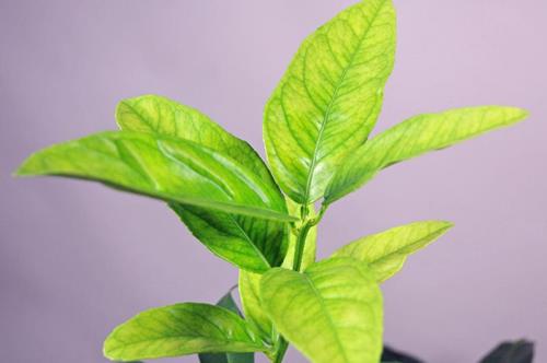 Deficiencia de hierro en hojas de limón.