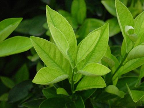 Deficiencia de hierro en hojas de naranjo.