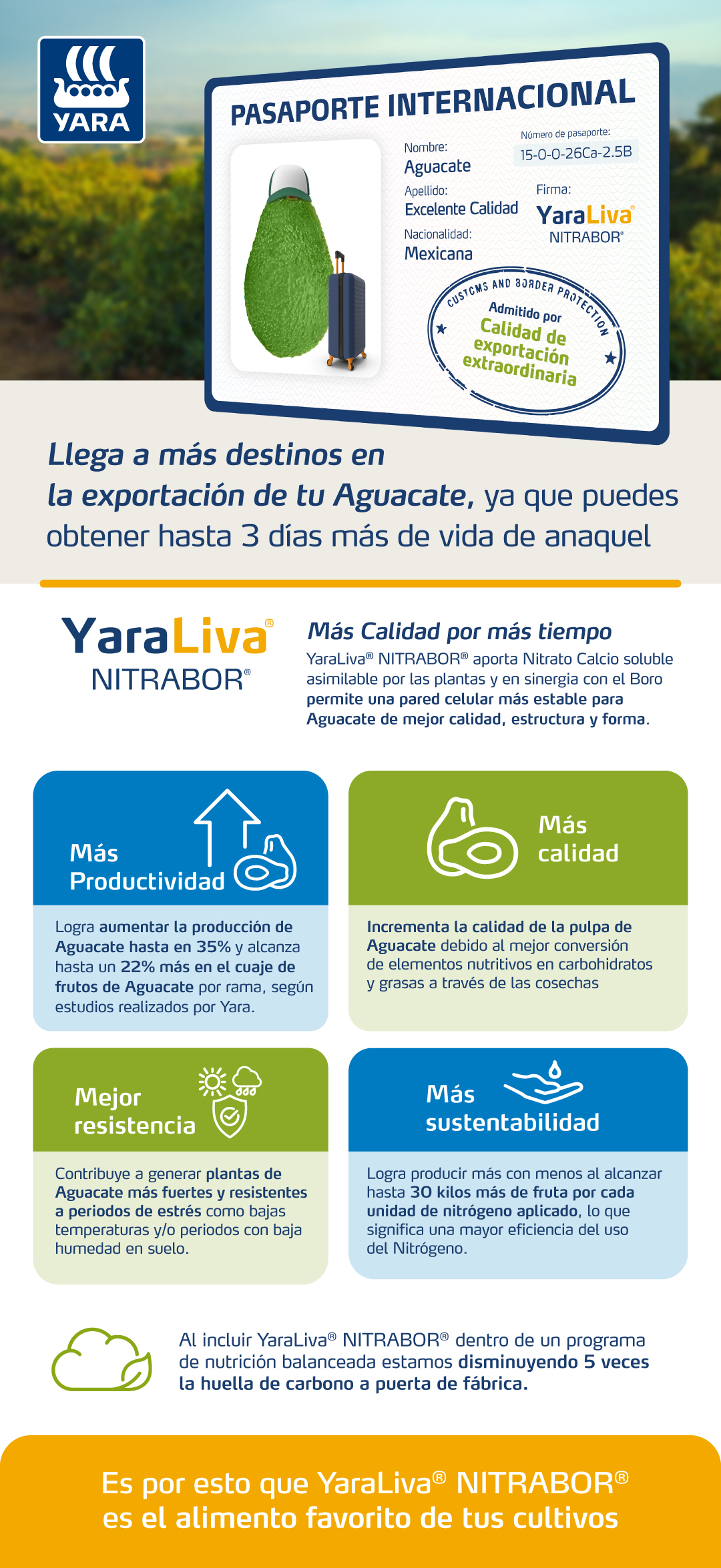 - Debido a la eficiencia de YaraLiva NITRABOR logra producir más con menos al alcanzar hasta 30 kilos más de fruta por cada unidad de nitrógeno aplicado, lo que significa una mayor eficiencia del uso del nitrógeno en Aguacate.