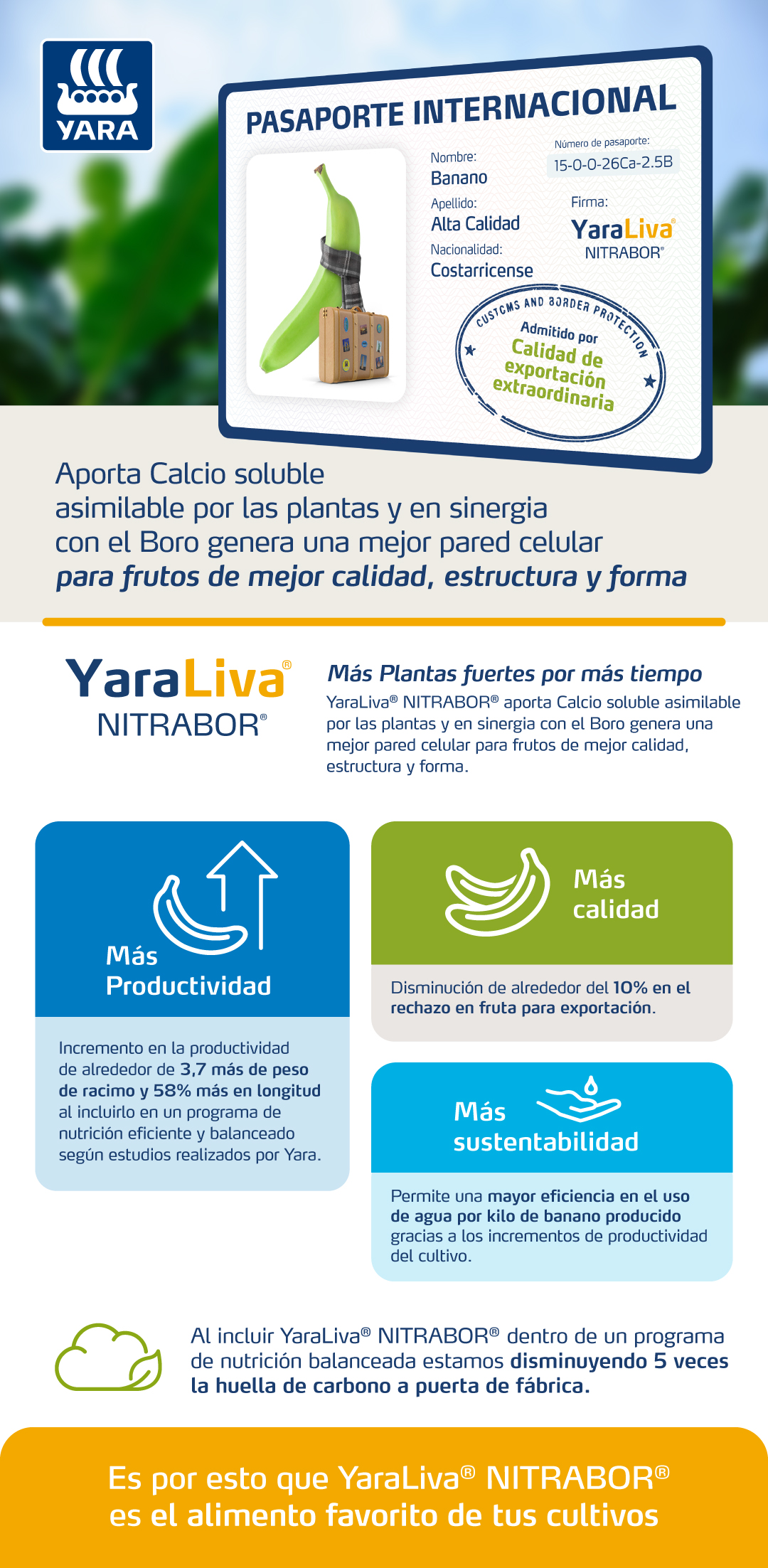- Logra producir más con menos al demostrar una tonelada más de producción en banano con 16 Unidades de nitrógeno menos con un programa que incluya YaraLiva NITRABOR.